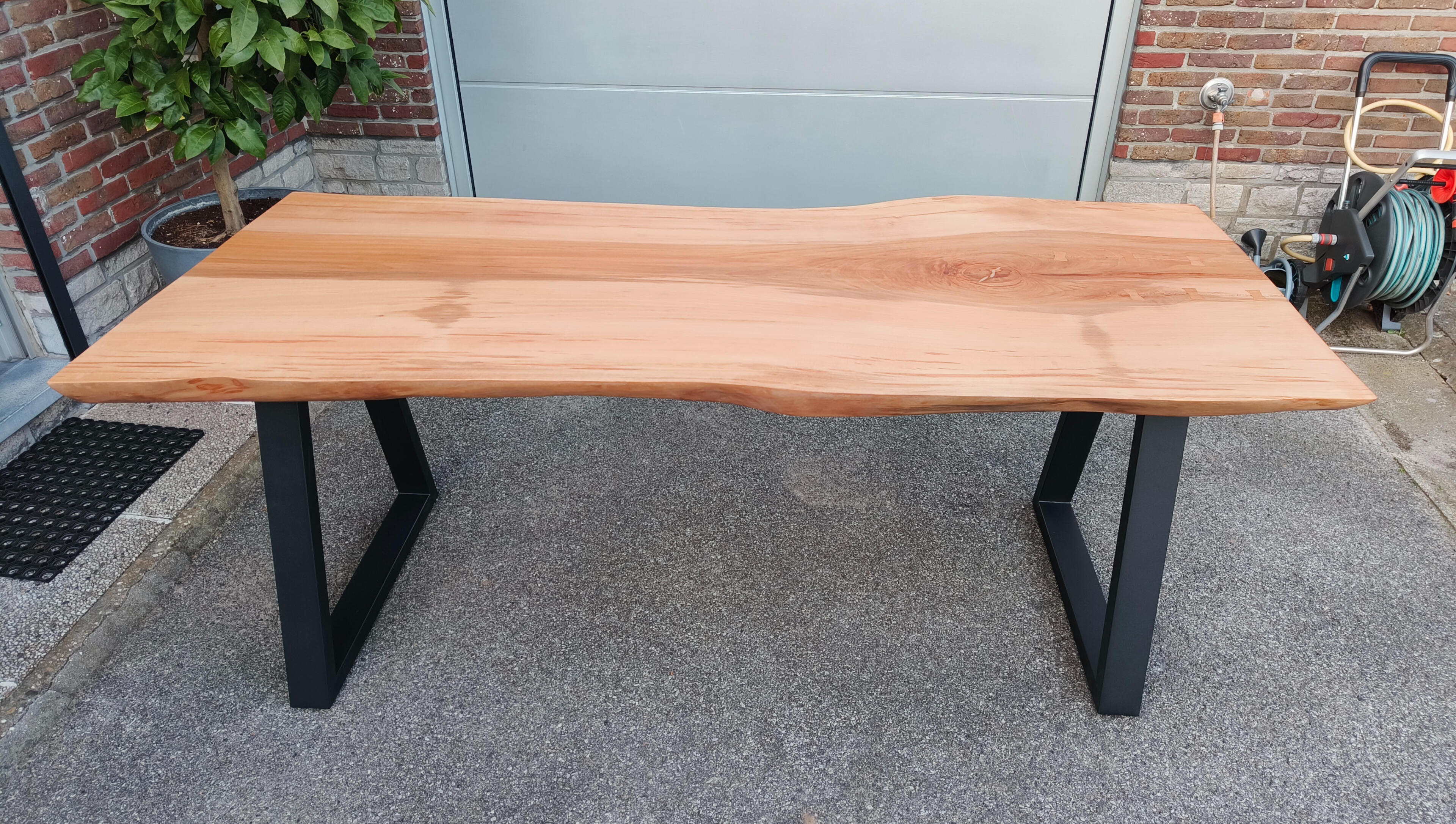 Deze salontafel is afgewerkt met kantenband in beukenfineer rondom beide tafelbladen. Voor dit meubelstuk koos ik voor een donkerdere afwerking met Osmo Cognac oliebeits, waardoor de houtnerf prachtig tot zijn recht komt.(* Een offerte is volledig vrijblijvend. Ik bezorg je een prijsindicatie en timing, en jij beslist daarna of je verder wil gaan.)